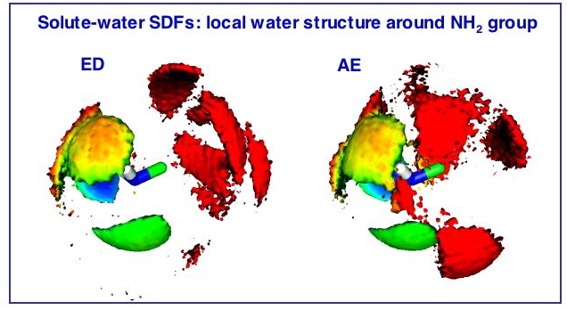 This project is a comparative computational study of the local structure of three widely used representatives of 1,2-disubstituted ethanes, namely ethylene glycol (EG), ethylenediamine (ED) and 2-aminoethanol (AE), in liquid state and their mixtures with water. Classical molecular dynamics combined with three-dimensional atomic density maps, known as spatial distribution functions (SDF’s), are the computational tools used in this study. The present work consists of three parts. In the first part, twelve molecular models were designed and gas-phase simulations were carried out for each. The results obtained were compared with the most reliable experimental estimates in order to test different force fields and molecular representations. In the second part liquid-phase simulations were performed on the most successful (AMBER/OPLS-based) models. The heats of vaporization and self-diffusion coefficients were used as criteria for the final selection of molecular models to be employed in the subsequent simulations of aqueous solutions. In the third part, a detailed structural analysis was performed. As an essential part of this analysis the dihedral angle distributions were calculated and relative populations of conformers with respect to the central dihedral angle were determined for pure EG, ED and AE, as well as their mixtures with water, where four compositions of each compound were considered. It has been confirmed that in the liquid phase the gauche conformation accounts for the major population of rotational isomers for EG and AE, while ED exhibits a significant population of trans conformers. Additionally, the first theoretical estimates of the compositional dependence of self-diffusion coefficients for the aqueous solutions of EG, ED and AE were obtained. The analysis of radial distribution functions in conjunction with calculated numbers of nearest neighbors around oxygen and nitrogen atoms of the main functional groups provided some structural insights into the H-bonding pattern of the systems studied. The number of strongly H-bonded neighboring groups was determined and their possible positions were located by means of SDF’s. The possibility of four-membered H-bond arrangements (comprised of two strong and two weak H-bonds) found around oxygen and nitrogen atoms leads to the conclusion that in the liquid phase the generalized H-bonding pattern for EG, ED and AE can be described as a three-dimensional, branched network.